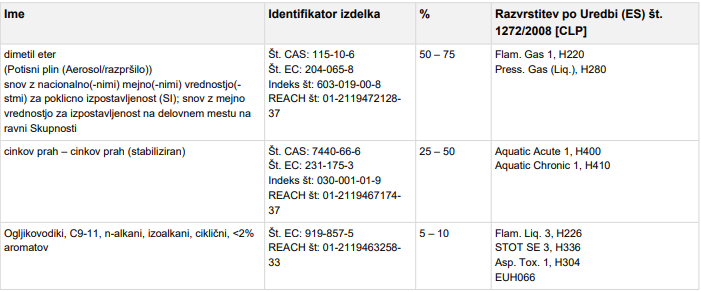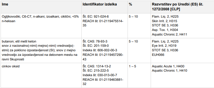 Vsebuje : Ogljikovodiki, C9-11, n-alkani, izoalkani, ciklični, <2% aromatov; Ogljikovodiki, C6-C7, nalkani, izoalkani, ciklični, <5% n-heksan; butanon; etil metil keton