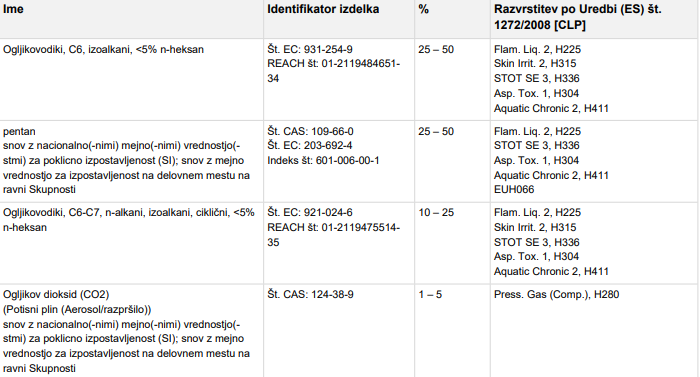 Vsebuje : Ogljikovodiki, C6-C7, n-alkani, izoalkani, ciklični, <5% n-heksan; Ogljikovodiki, C6,