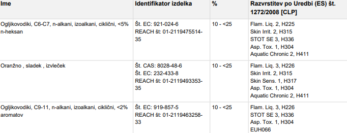 Vsebuje : Ogljikovodiki, C6-C7, n-alkani, izoalkani, ciklični, <5% n-heksan; Oranžno , sladek ,