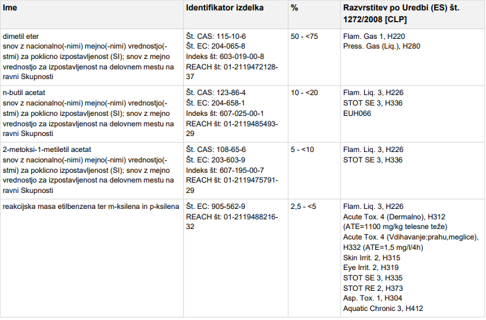 Stavki o nevarnosti (CLP) : H222 - Zelo lahko vnetljiv aerosol.