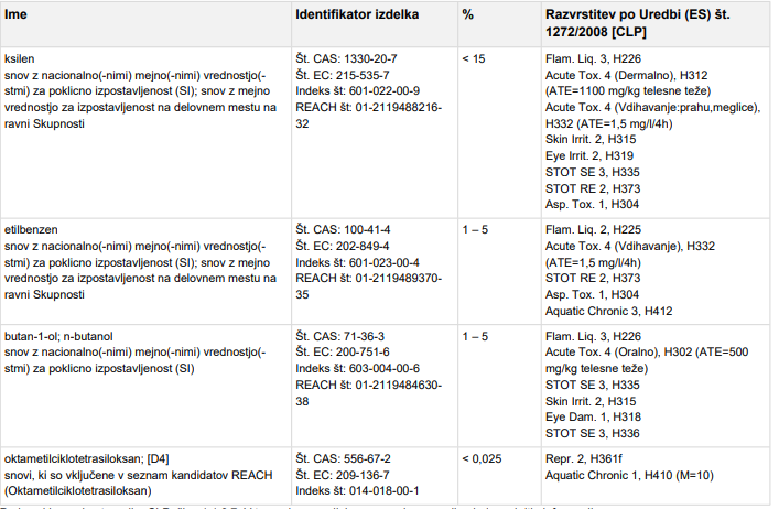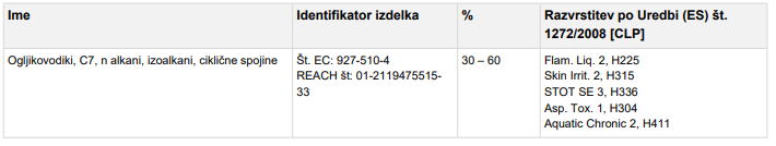 Vsebuje : Ogljikovodiki, C7, n alkani, izoalkani, ciklične spojine; butan-1-ol; n-butanol; ksilen