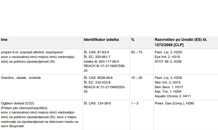 Vsebuje : Oranžno , sladek , izvleček; propan-2-ol; izopropil alkohol; izopropanol