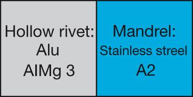 Design: Hollow rivet made of aluminium AIMg 3, rivet mandrel made ​​of stainless steel A2 (1.4541).