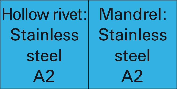 Design: Hollow rivet made ​​of stainless steel A2 (1.4567) and rivet mandrel made ​​of stainless steel A2 (1.4541).