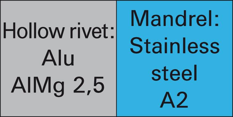 Design: Hollow rivet made of aluminium AIMg 2.5, rivet mandrel made ​​of stainless steel A2 (1.4541).