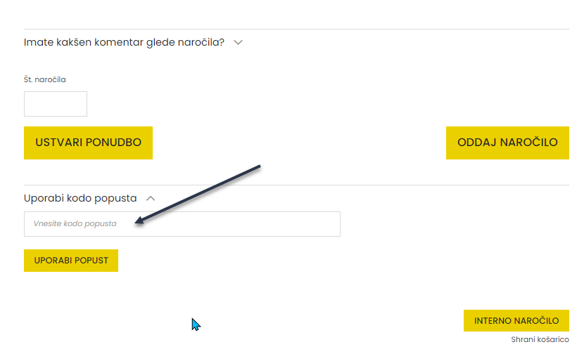 - Pred oddajo naročila vnesite kodo kupona v polje "Uporabi popust".